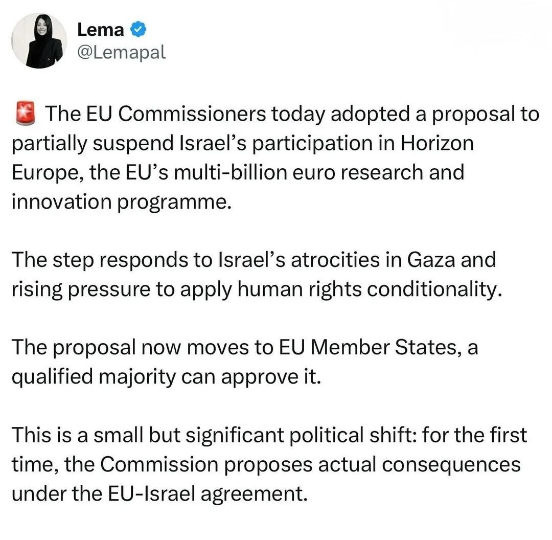 Op maandag 28 juli 2025 nam de Europese Commissie een voorstel aan om Israël’s deelname aan het Europese onderzoeksprogramma Horizon Europe stop te zetten. De deelname zou vooralsnog tijdelijk zijn, en moet nog worden goedgekeurd door een meerderheid van EU lidstaten.
